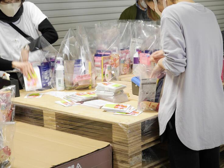 様々な種類の商品が企業様より届きます。その商品たちを、バランスよく喜んでいただける組み合わせになるように、事務局で組み合わせを決めていきます。