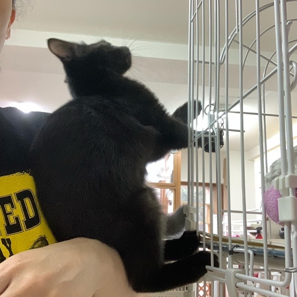 ケージをよじ登ってきて、私の腕に腰掛けて休憩し始めまして