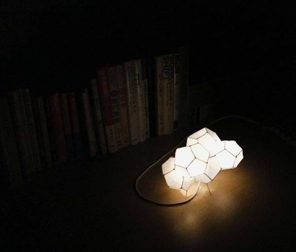 一つのあかりは、五角形で構成される十二面体を、五個もしくは十個組み合わせ、制作されています。幾何学的な造型でありながら、民藝作品の中にあるような、手のぬくもりが感じられ、どこか可愛らしく、間の抜けている雰囲気を、同時に持っているあかりを目指しました。