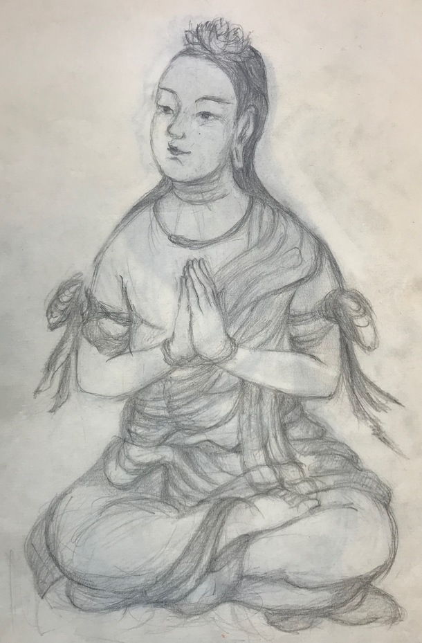 ほほ笑みを浮かべ、すべてを赦し、ぬくもりをもたらすような表情と、優しさだけではなく、強い意志をもつことを示すようなきりっとした眉が描かれています。