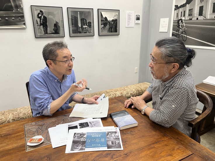 おふたりの後ろに見えるのは、宍戸さんのライフワークである、日系2世兵の写真の数々です。