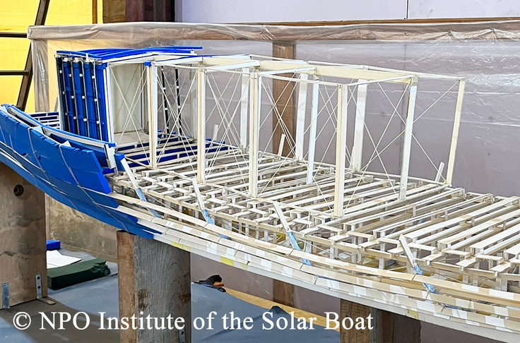 これらを組み立てて船を復原するためには、鉄骨やプラスチック、透明な材料などを用いた、かなり精密かつ大がかりな補強用の骨組みを作り、木の部材そのものも、先進的なナノテクノロジーを用いた方法で、さらに補強処理を施す必要が出てきました。