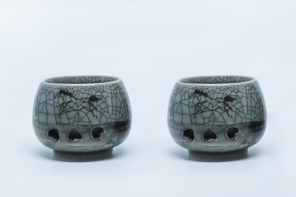 江戸から明治に移り変わると、廃藩置県により、大堀相馬焼は藩の援助を失いました。他県から大量に流れこんでくる焼物を前に、どうにかして差別化しようと試行錯誤する中で生まれたのが、「青ひび」の地模様と「二重焼」の技法です。