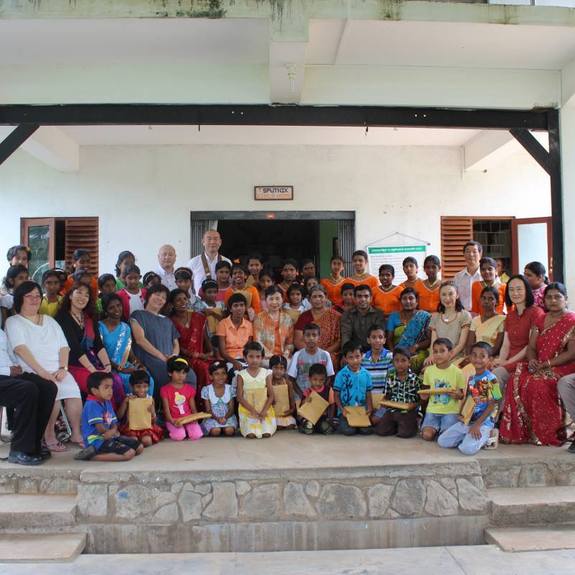 (NPO法人心とからだの研究会外山美恵子理事(中央)とNPOプロジェクトチームのみなさん、孤児院の子どもたち、シンハラ族・タミル族の女性たち)
