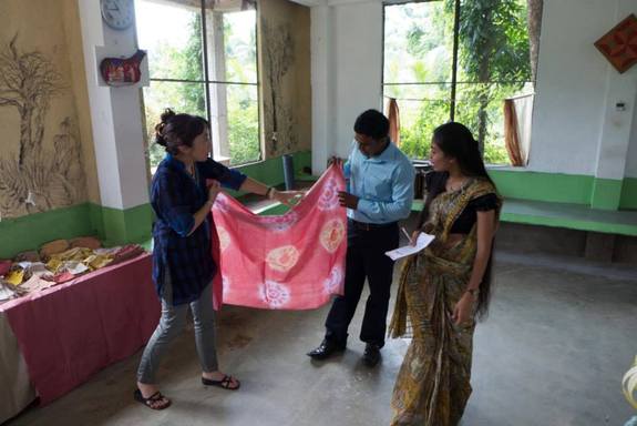 事前に工房でも、デザインの担当者ワサンタさんを中心に何度か試作をして、うまくできるようになってきたという作品を見せていただきました。その後、日本側と工房のスタッフが一緒に布にゴムや糸をまいたり、割り箸をつかったデザインを考えたり、ロウをぬってみたりして、共同デモンストレーションを行いました。工房のスタッフの糸巻き作業は、とても早くて、日本側はびっくりのようでした。技術が上がってきたのだと嬉しい限りでした。できた染め模様を見る評価ミーティングにて、参加してくださった地元女性は、「(この染めで)サリーを作りたい」や「ソファにおくクッションカバーにしたい」という声がありました。地元で販売することができれば、徐々に自立につながっていくのではないかと考えています。
