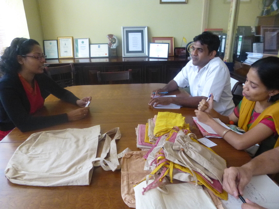 前回のビジネスワークショップを受けて、スリランカ国内の大手のグループホテルへ営業をいたしました(写真上)営業の出だしは、少々緊張気味でしたが、自分たちのプロジェクトのコンセプトである″エコ”を語るときには、自信満々!自分の仕事に誇りをもって臨んでいることがよく伝わりました。結果、大量のホテルのランドリーバッグの見積もり依頼をいただきました。いつも依頼している会社との競争となるそうですが・・・。