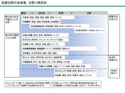 併せて、繰り返される被災者支援の課題を、14分野に分け、それぞれのガイドラインを作成していきます。まずは、「子ども」「食と栄養」「家屋保全」の3分野についてガイドラインにまとめました。現在、「外国人」「物資」のガイドラインの作成を進めています。