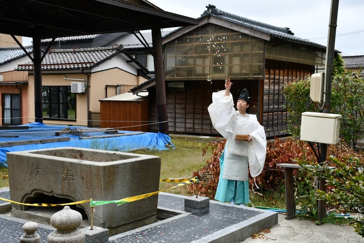 神前での祈祷後、手水舎再建場所のお清めを致しました。