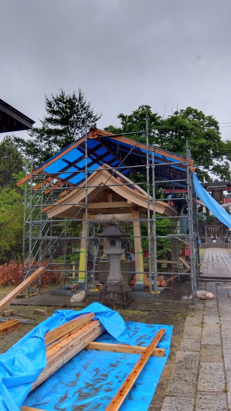 柱や屋根を組み立て手水舎の骨格が出来上がりました。