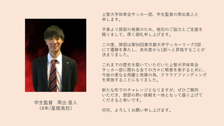 そこで、私たち上智大学体育会サッカー部は、クラウドファンディングに挑戦します。