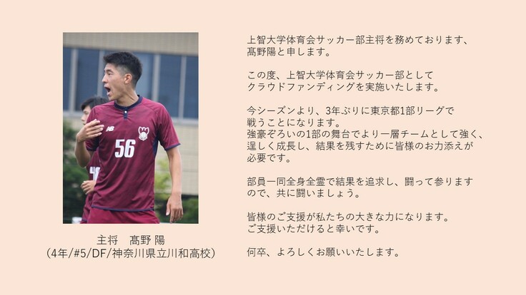 ご支援を頂いて集まった資金は、私たち上智大学体育会サッカー部が半年分のグラウンド費用と、B,Cチームの公式戦参加費に使用させていただきます。