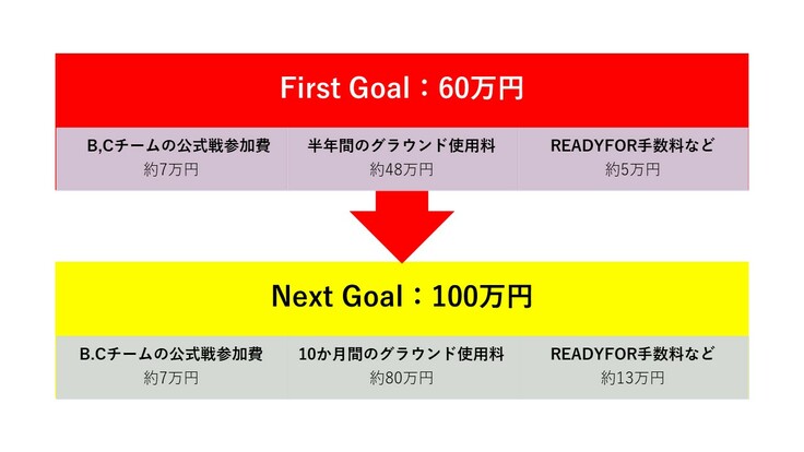 今後についてですが、プロジェクト概要に記載してあります通り、残りのシーズン4か月分のグラウンド使用料をご支援いただくために、ネクストゴールとして新たに目標金額を100万円に設定させていただきます。