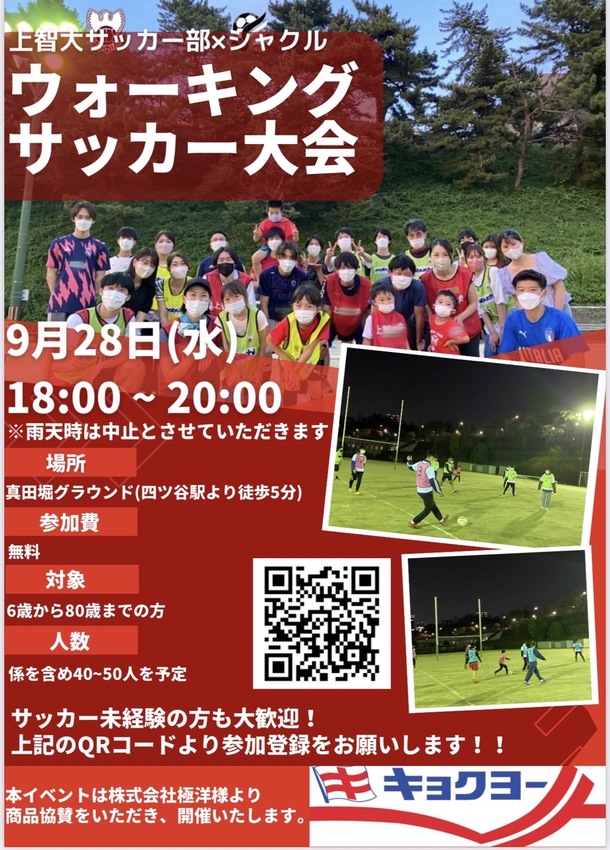 サッカーを通じた社会貢献を目指す上智大学公式団体sircle(シャクル)と連携し、上智大学の学生や教職員、周辺地域の方々をつなぐ「ウォーキングサッカー大会」の第5回を開催いたします。