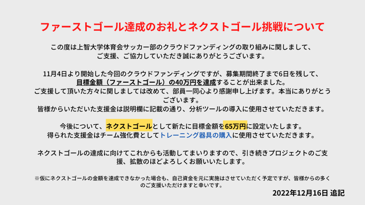 ご支援を頂いて集まった資金は、私たち上智大学体育会サッカー部の強化費用として新たな分析ツール「Hudl」の契約と、フィジカルトレーニング用の器具購入時に使用させていただきます。