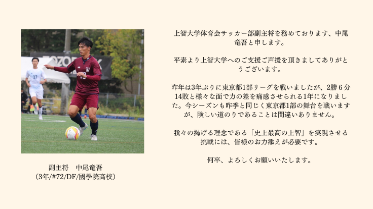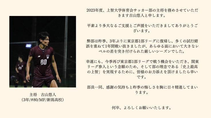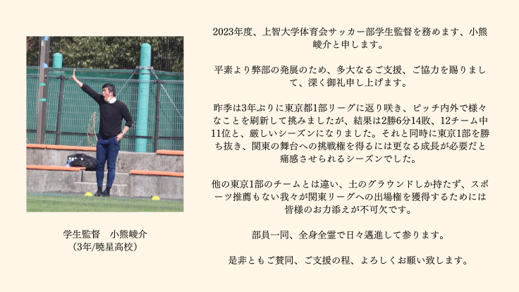 プロジェクトをご覧いただきありがとうございます。上智大学体育会サッカー部です。