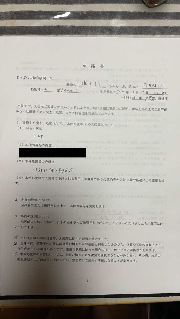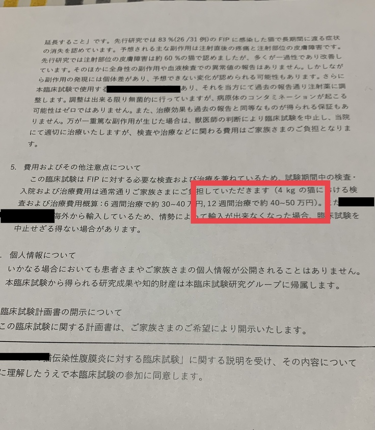 FIPの治療費、検査費、交通費にあてさせていただきます。
