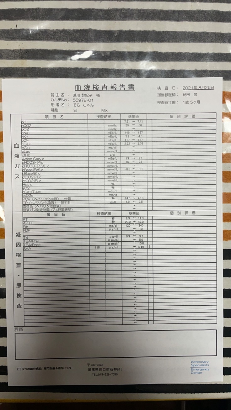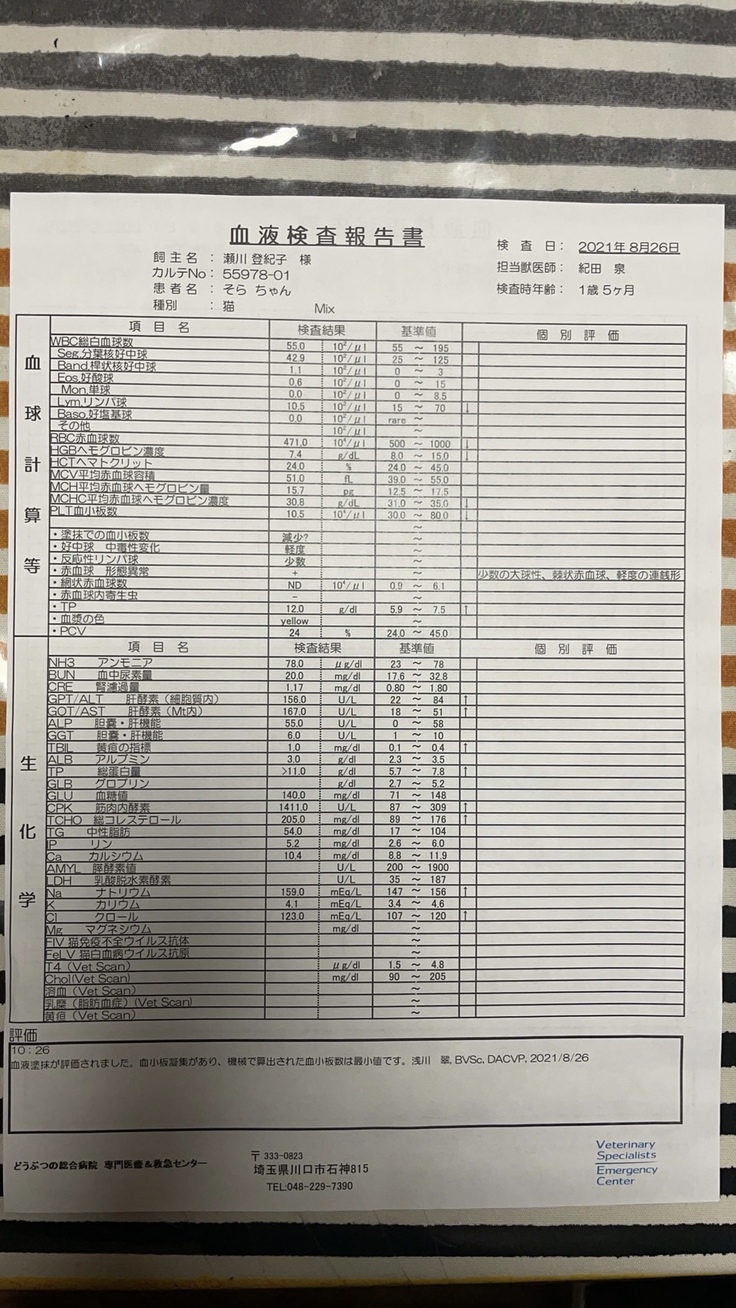 熱は、39.5度と高い状態。採血をして検査してもらったところ、FIP(猫伝染性腹膜炎)の疑いと言われました。更に精密検査をすると言われ結果を待つことに。