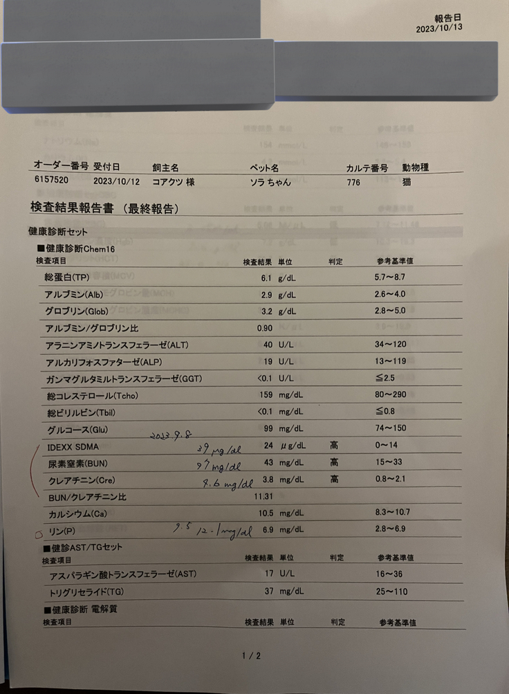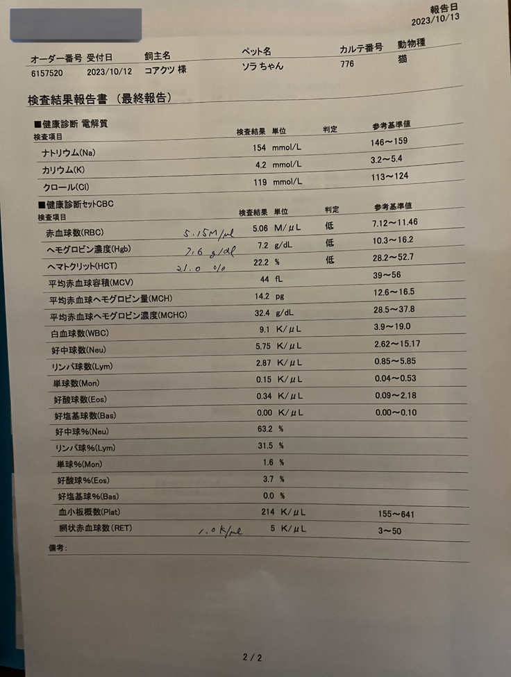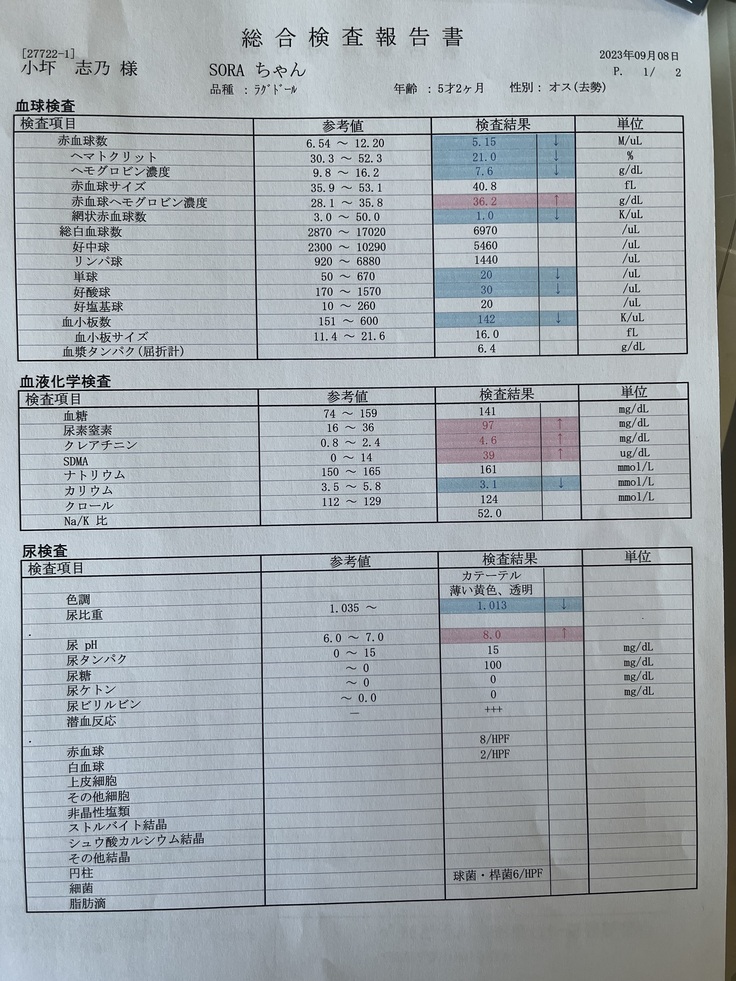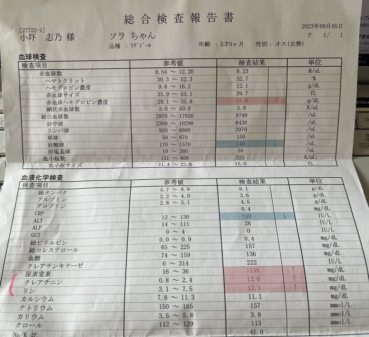 あまり元気が無いように感じたのと、動くのがだるそうに見えたため、9/5にかかりつけ医に連れて行きましたが、夕方に来院、血液検査の細かなデータを取るのは外注に出して、1週間は結果が出ないということで、24時間体制の病院を紹介して頂き、