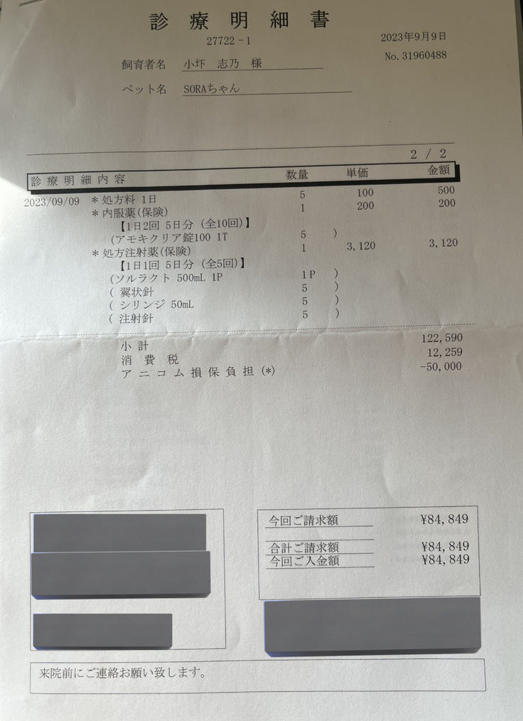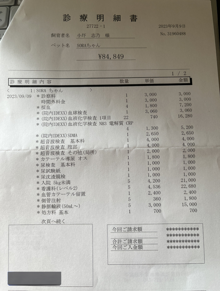 2023 9/9 緊急で行った病院にて入院(9/5-9/9)、検査費用、薬代:\84,849(上記にて明細添付)