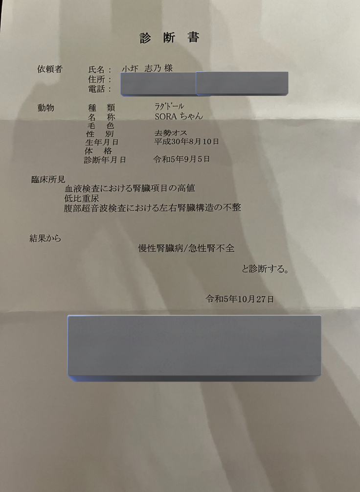 血液検査、エコー検査を行い、慢性腎臓病と診断されました。