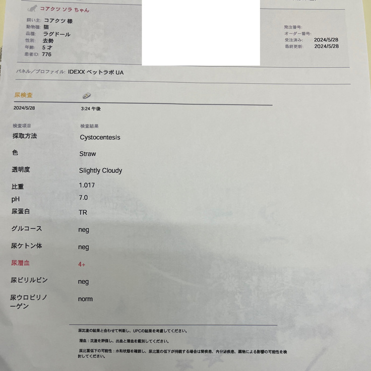 一昨日の夕方ソラのお迎えと尿検査結果聞きました。