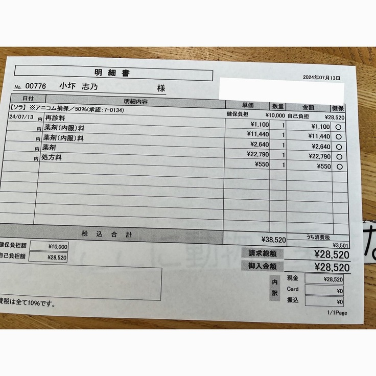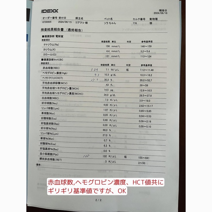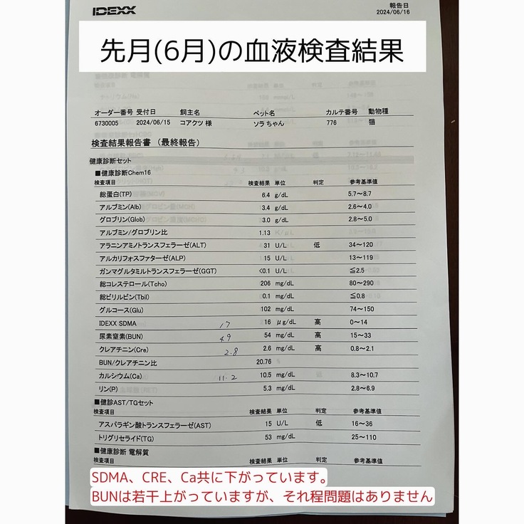 先月(6月)の血液検査結果が良かったのと体重も先月に比べ増えたため、今回は血液検査はパスでいいだろうということで採血無しでした。