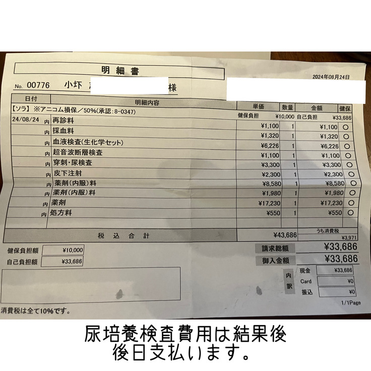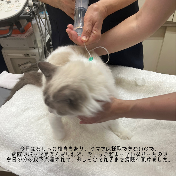 おしっこ取ってもらおうとエコーで見たら、溜まっていなかった為、今日の分の皮下点滴をしてもらい夕方まで病院で預かってもらい、膀胱に溜まったタイミングで膀胱穿刺で採取しました。