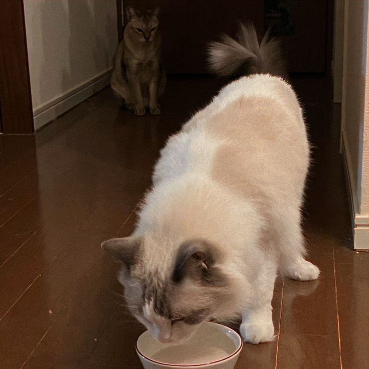 写真は水分補給に鳥ささみ味のお水を飲んでるところ。
