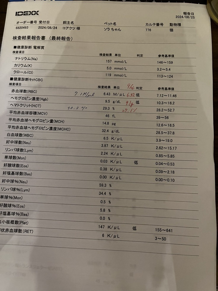 確実に減って来ていて、来月の検査でこれ以上少なくなるようだと、エモペット(腎性貧血改善用ホルモン剤)を久しぶりに打つことになる予定です。