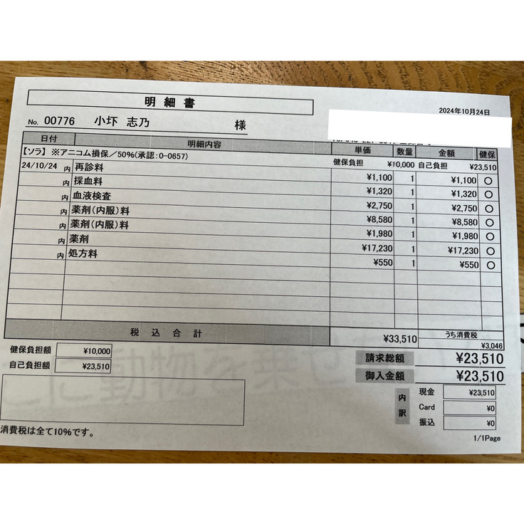 本日の医療費領収書⇩