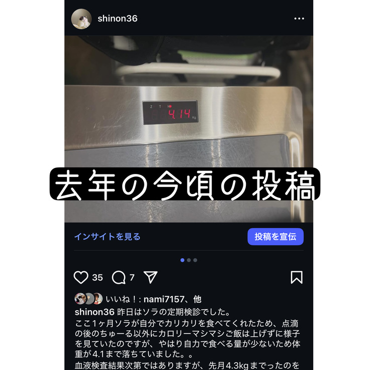 去年の今頃の検診投稿見直したら、体重も4.14kgとめちゃくちゃガリガリだった。