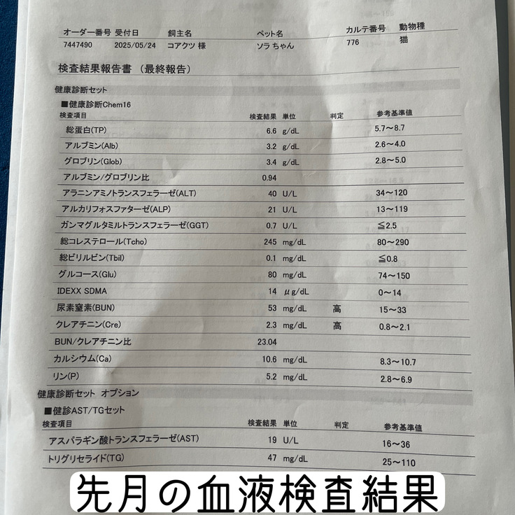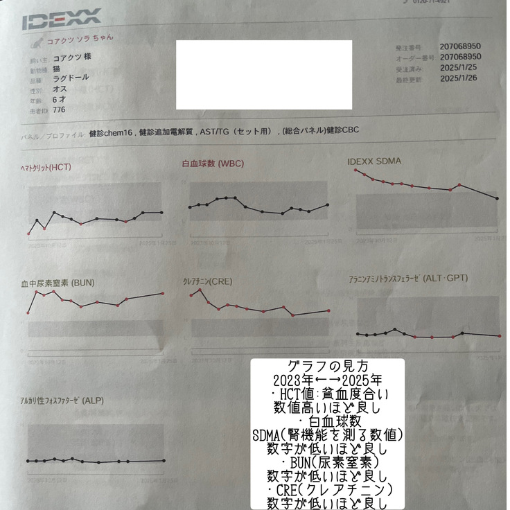 途中貧血になって造血ホルモン剤を打ったりしたこともありましたが、腎機能の数値のSDMAが正常値迄もって来れたのが奇跡やと思います。