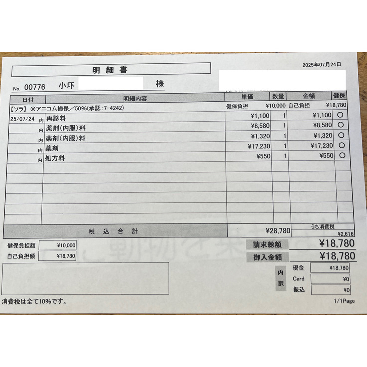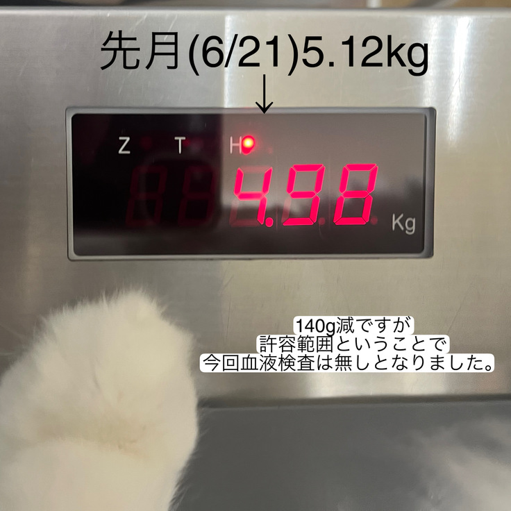 体重は先月(6/21)5.12kg→4.98kgと140g減ったものの、許容範囲ということで、今回も血液検査無しとなりました。