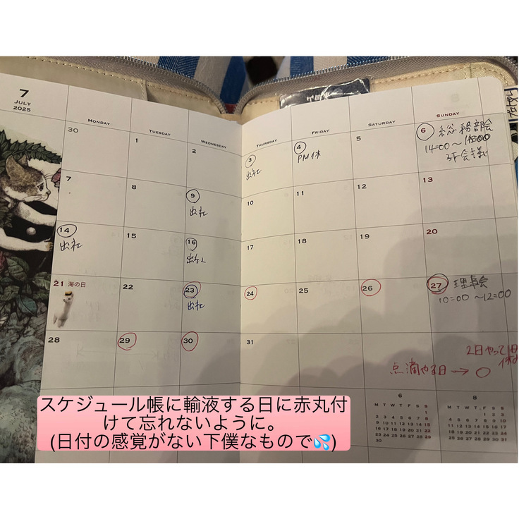 私自身日付の感覚がないので、家に帰ってから手帳に輸液する日に赤丸をひたすら付けていましたw