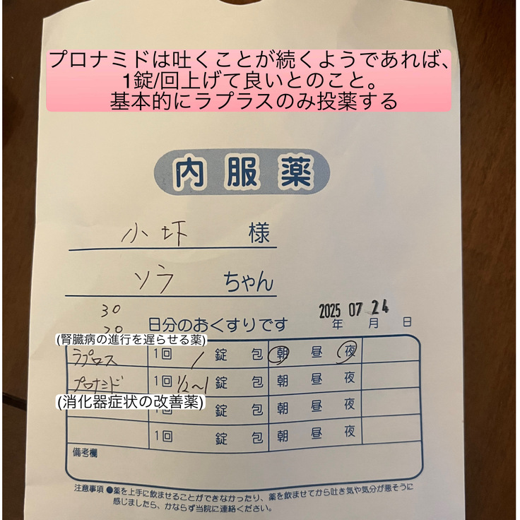 ラプラス(腎不全を遅らす薬)は引き続き1日2回投薬して、胃腸を促すプロナミドは基本的に上げない方向で、吐くことが続くようだったら1錠あげて様子見ることしました。