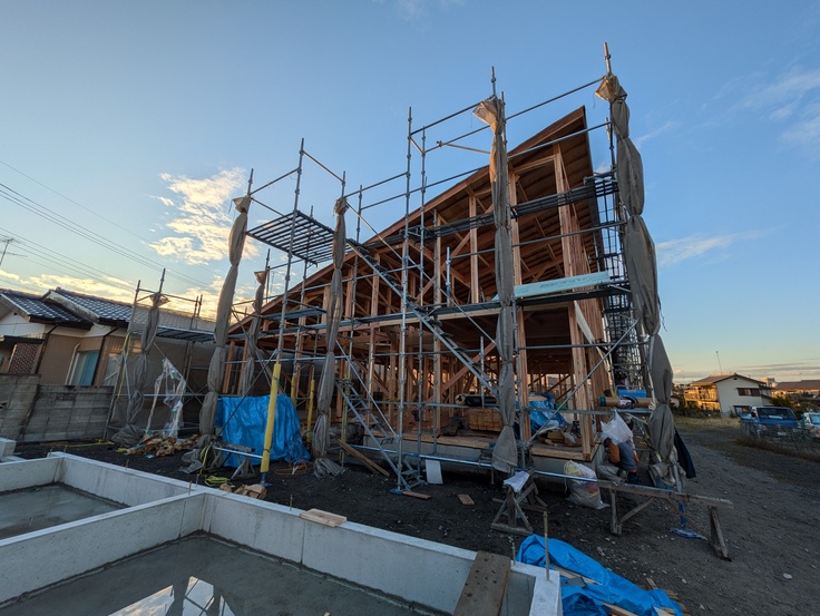 多機能型事業所そらまめの新しい施設は2つの棟に分かれます。手前の棟が「そらまめ食堂」奥の棟が「工房・ファーベ・事務所」になります。その奥の棟が上棟の日を迎えました。