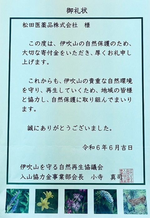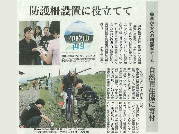 皆さまからご支援頂きました3,565,000円の内、蘇湯の製作費や活動費用を差し引きまして、寄付金額(総額の10%):356,500円を「伊吹山を守る自然再生協議会」へ寄付を致しました。