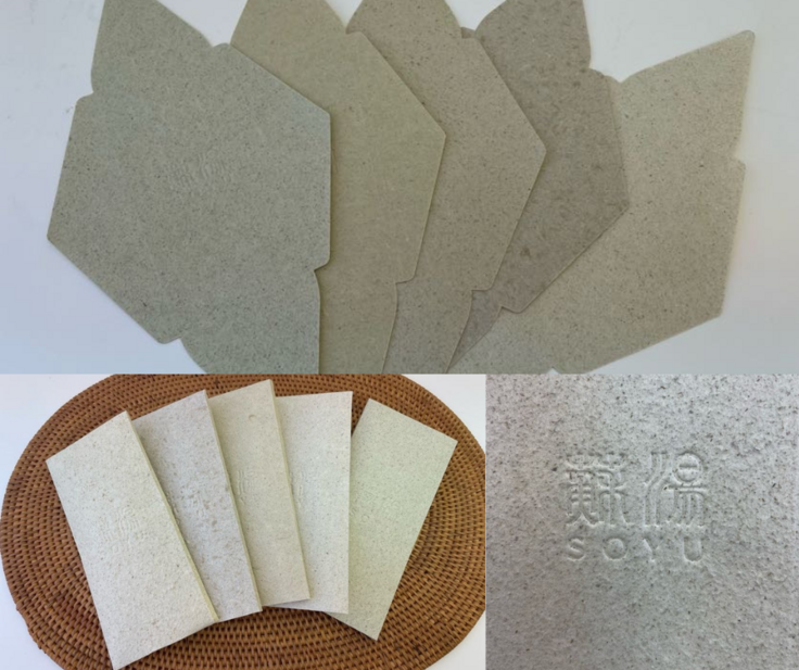 ゲンノショウコ、ヨモギ、スギナ、イブキジャコウ、それらをミックスしたものを和紙へ練り込みました。