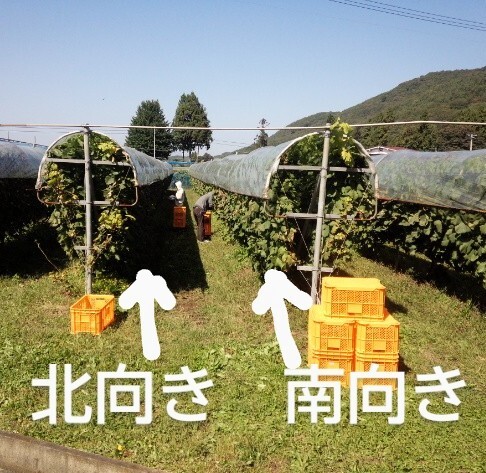 この2種類のワインは同じ畑、同じ樹で、北向きの枝の房(リースリング・リオン)と南向きの枝の房(フロイデ)を分けて醸造したものです(下の写真参照)。別々のワインになったものが10年の時を経て一緒になります。リースリング・リオンの特徴であるしっかりとした酸と、熟成により深みを増した味わいがビン内に次発酵でスパークリングワインに生まれ変わります。