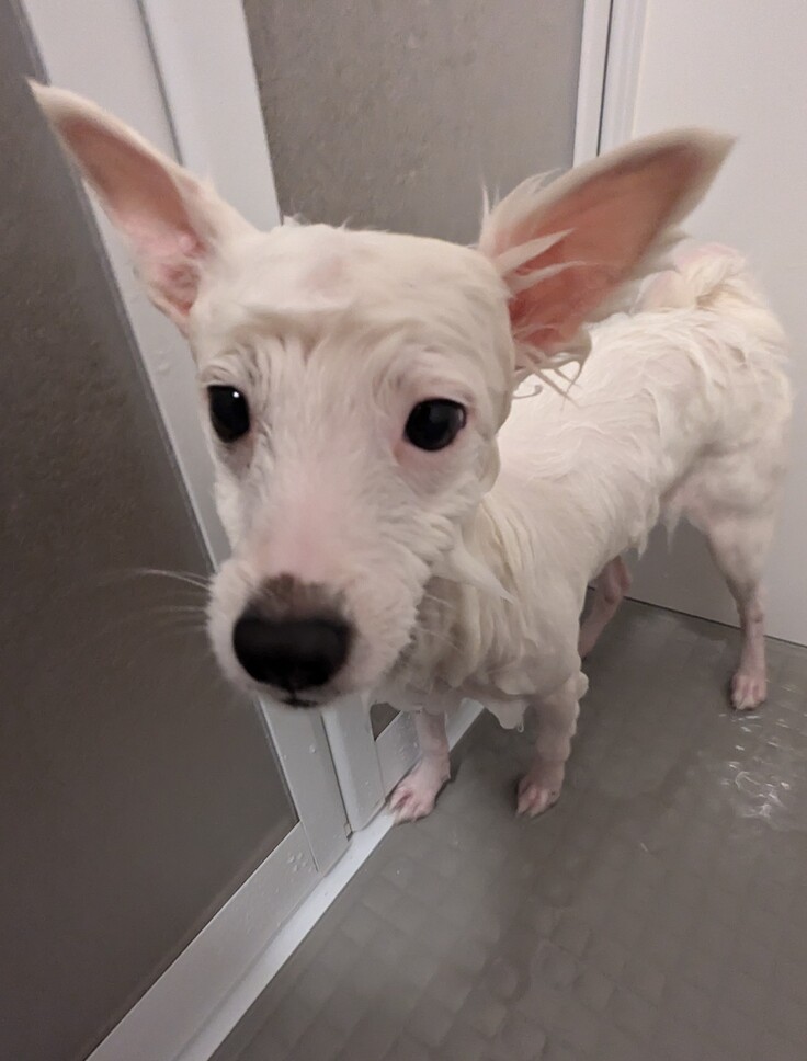 トレードマークのフワフワ毛が濡れると…全然違うワンコに見えるね!