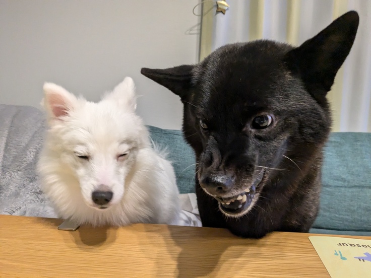 そんなことはつゆ知らず、もなか(甲斐犬)に怒られている、すあま(スピッツ)。
