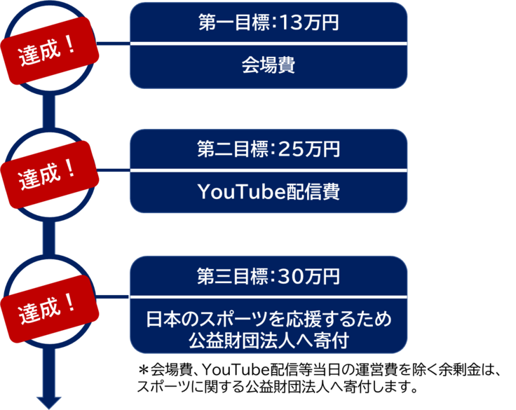 皆さまから頂いた寄付金は、当日のYouTube配信などの運営費用の活用と、日本のスポーツを応援するため公益財団法人へ寄付させて頂きます。