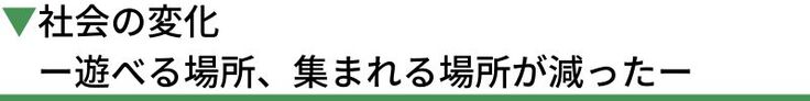 核家族化や町内会の高年齢化により、町内会を始めとした「地域コミュニティの繋がり」が薄くなっていることも、子どもたちの遊べる場所、集まれる場所が減った一つの要因になっているかもしれません。