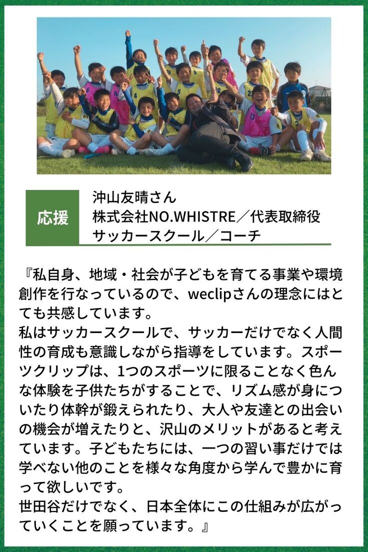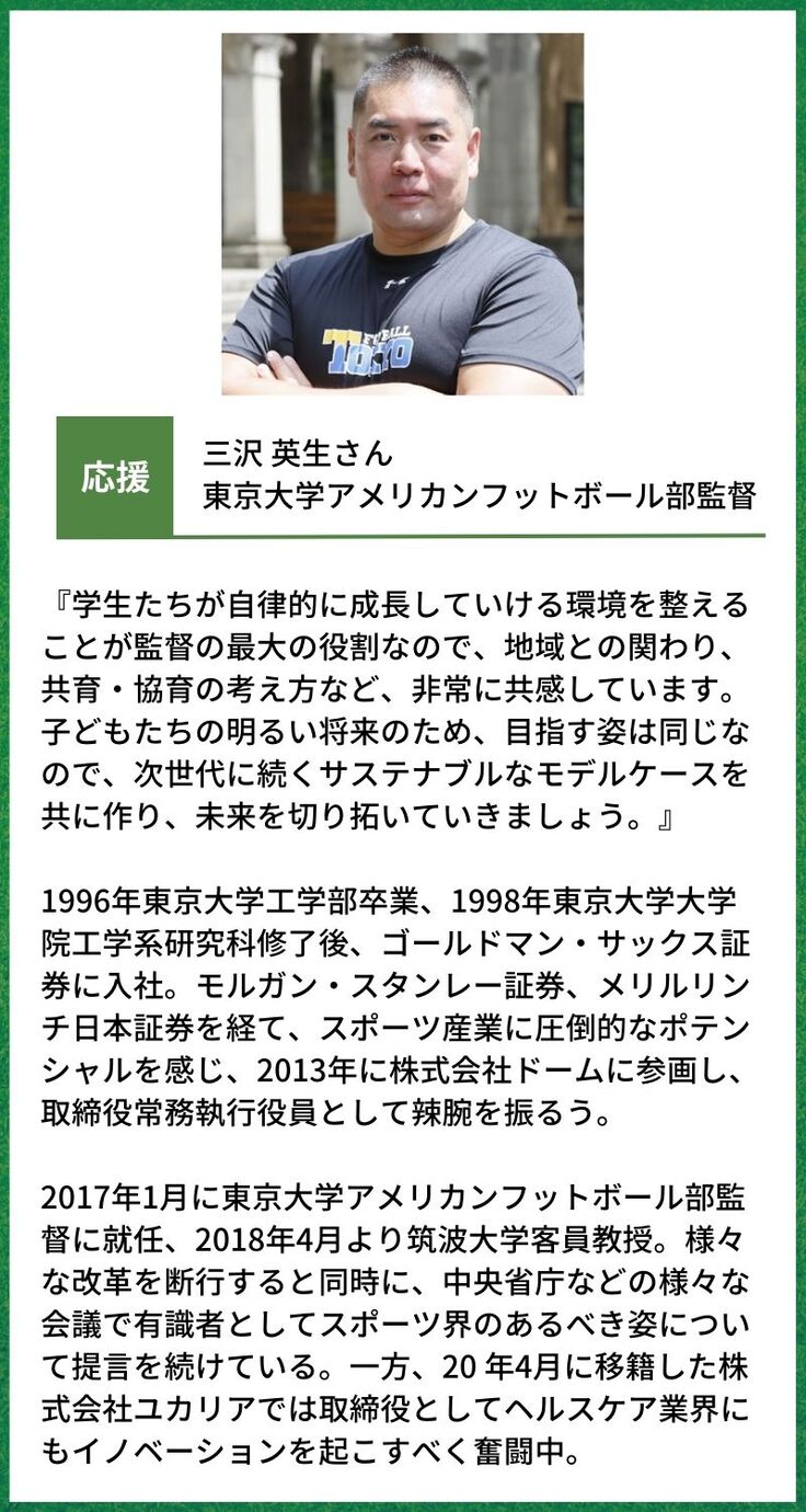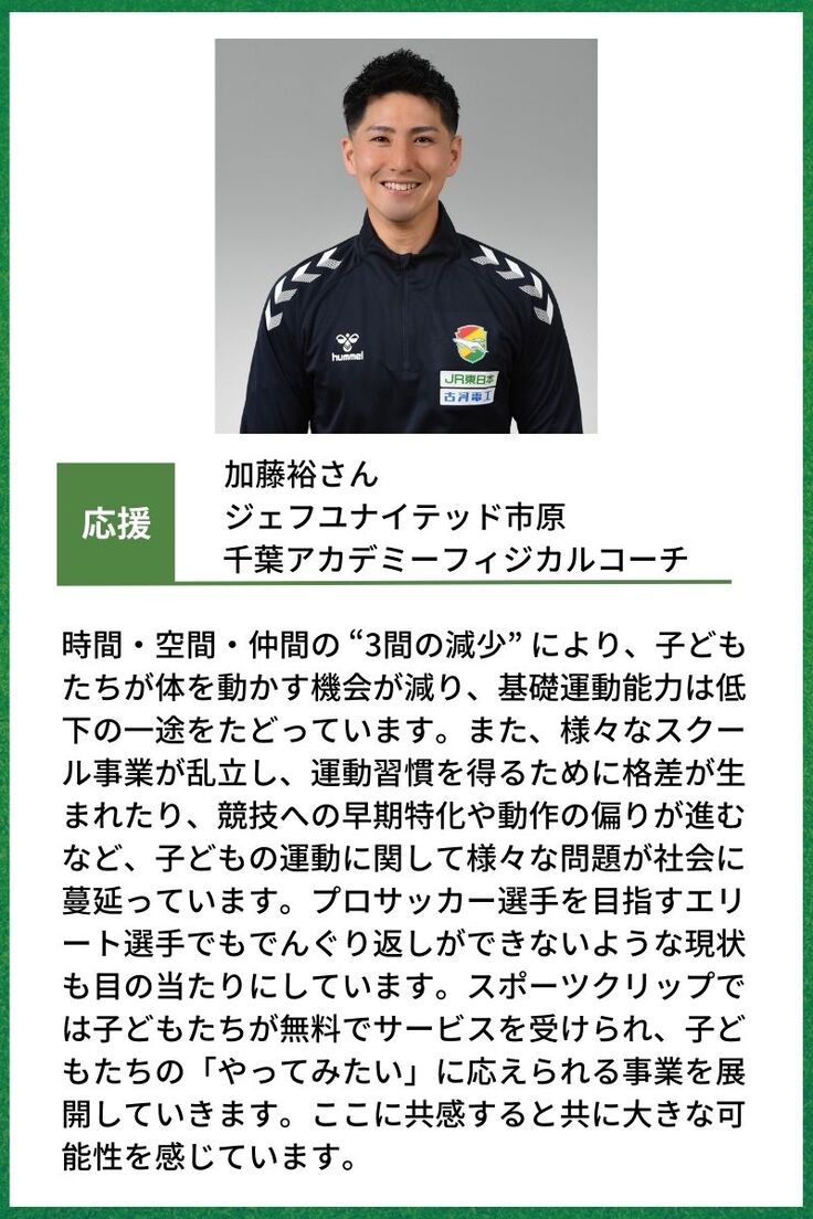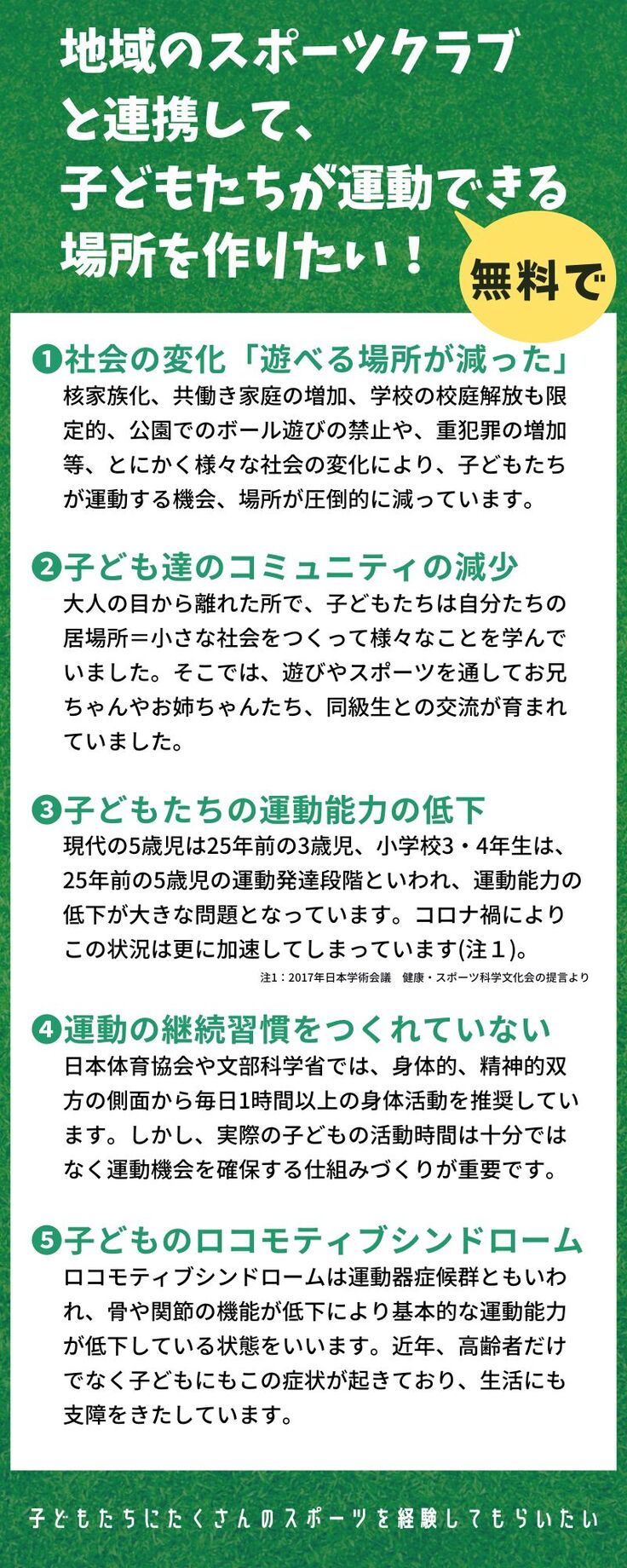 そして、私たちは学業だけでなく、サッカーやそのほかのスポーツを通じて様々経験をし、たくさんの人と出会えて今の自分たちが形成できたと思っており、子どもたちに様々なスポーツ機会を提供することと、子どもたちの居場所づくりを支援する取組みを始めました。