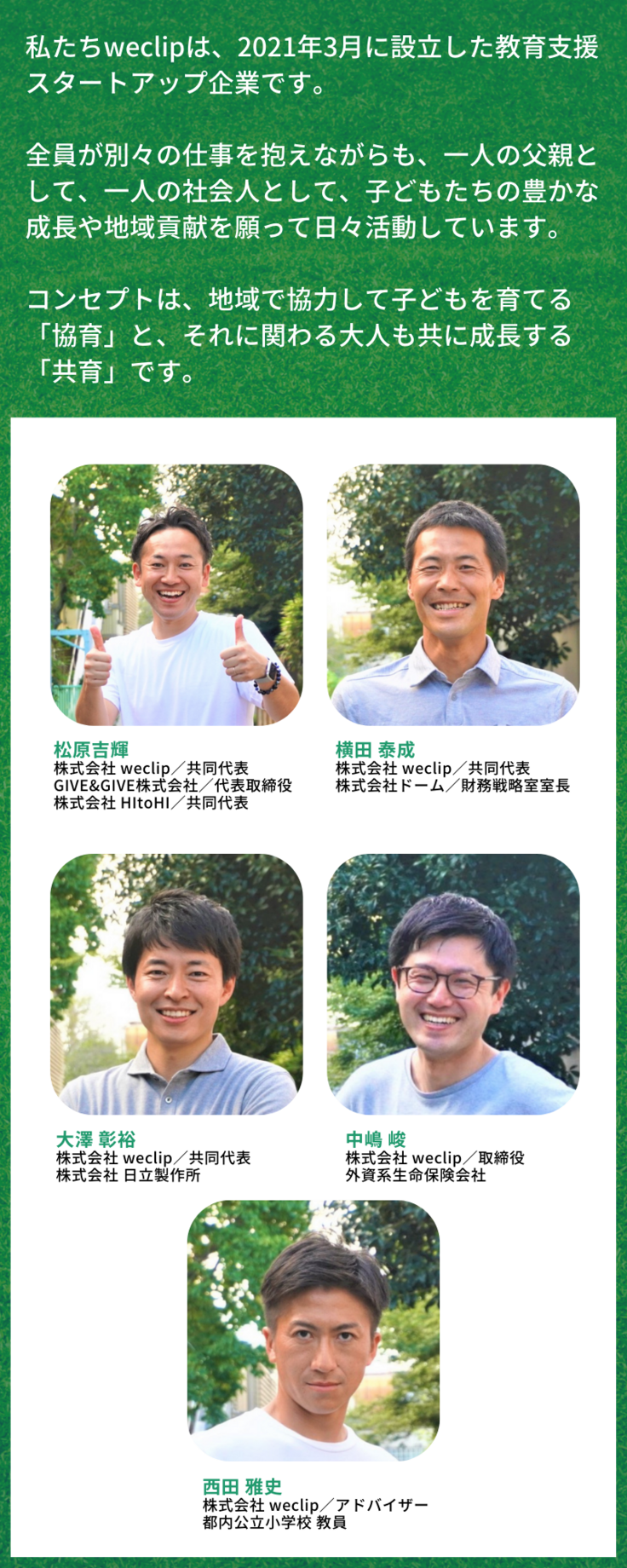 私たちweclip(ウィクリップ)は、子どもたちがより豊かな人生を歩むために、学校、家庭、地域、企業と連携し様々な教育機会を子どもたちに提供することを目指しており、地域に根ざした「協育基盤」をつくることをミッションとしている会社です。