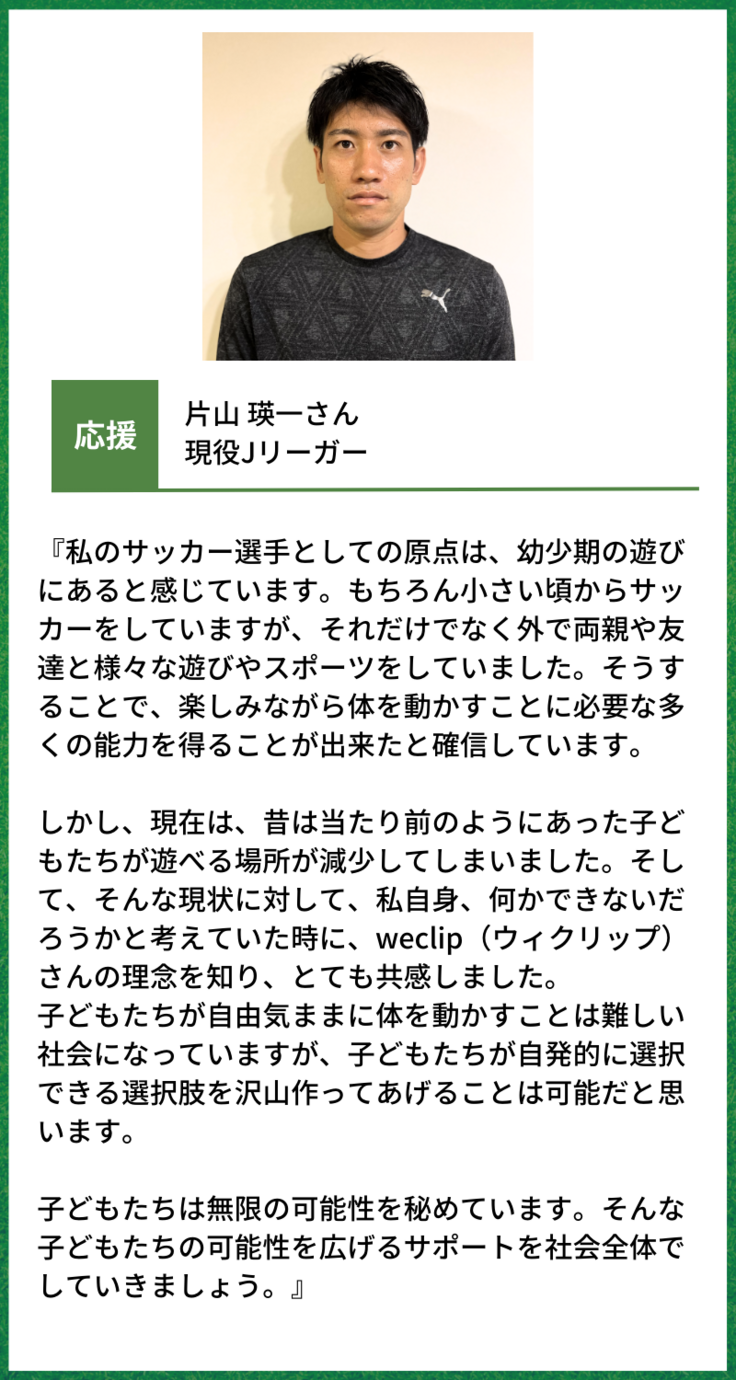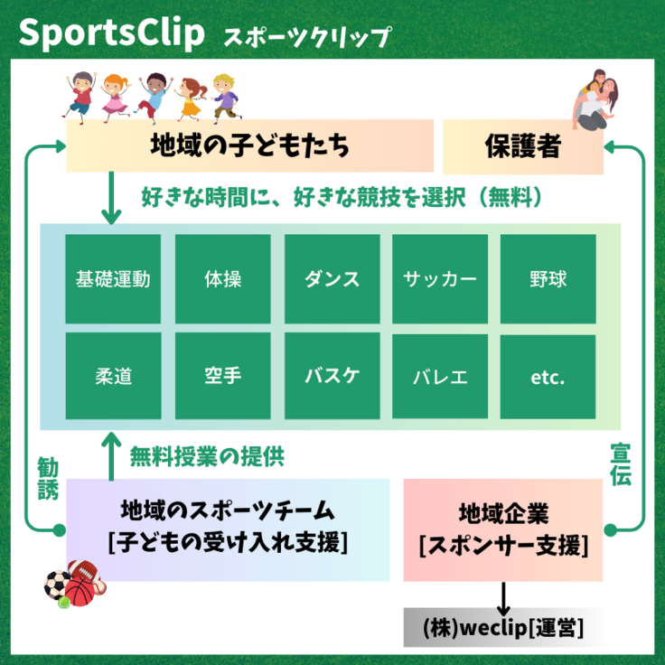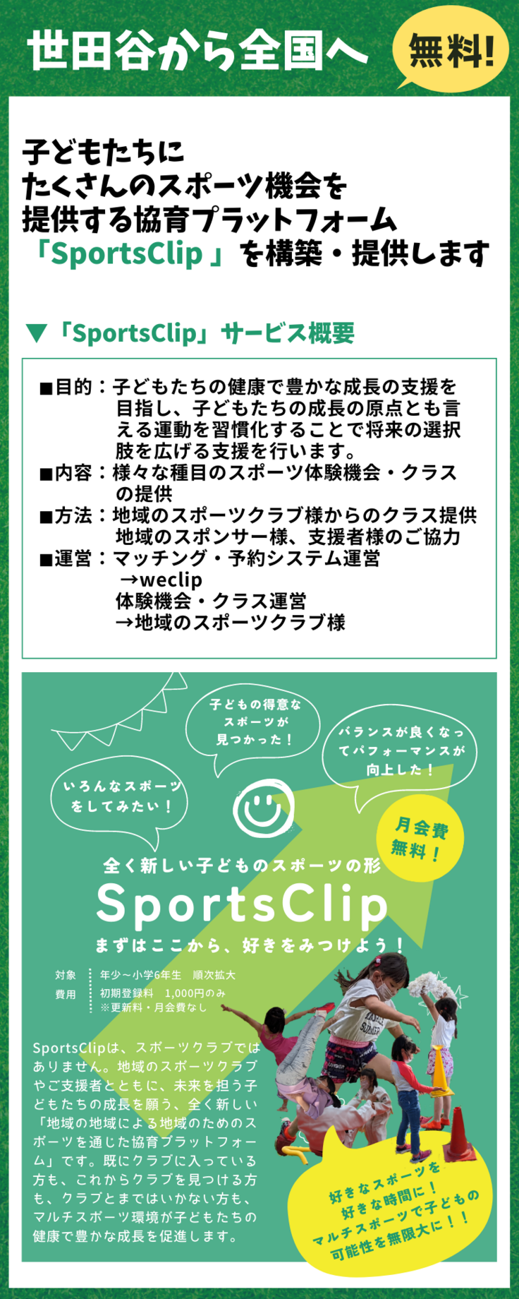 でも、今は子どもたちが自由に集まって遊べる場所が減ってきて「小さな社会」を作ることが難しいのであれば、私たち民間企業が「子どもたちが集まれる場所」を作り出すべきだと考え、私たちweclipは「子どもたちの居場所×スポーツ環境」を社会全体に作り上げるために、「SportsClip(スポーツクリップ)」サービスを発展させたいと思っています。