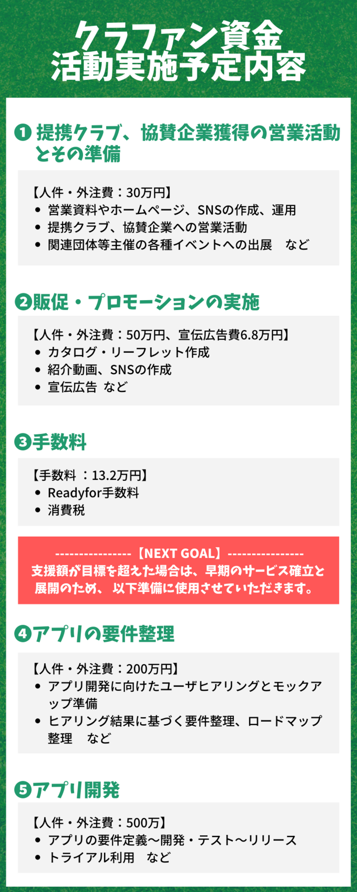 株式会社weclipにて、以下の活動を実施いたします。 1.提携クラブ、協賛企業獲得の営業活動とその準備 【人件・外注費30万円】 ・営業資料やホームページ、SNSの作成、運用 ・提携クラブ、協賛企業への営業活動 ・関連団体等主催の各種イベントへの出展 など 2.販促・プロモーションの実施 【人件・外注費50万円、宣伝広告費6.8万円】 ・カタログ・リーフレット作成 ・紹介動画、SNSの作成 ・宣伝広告 3.手数料 【13.2万円】 ・Readyfor手数料 ・消費税 --------------------【NEXT GOAL】-------------------- 支援額が目標を超えた場合は、早期のサービス確立と展開のため、 以下準備に使用させていただきます。 4.モバイルアプリの要件整理 【人件・外注費 200万円】 ・将来のアプリ開発に向けたモックアップの準備とユーザヒアリング ・ヒアリング結果に基づく要件整理、ロードマップ整理 5.アプリ開発 【人件・外注費 500万】 ・要件定義〜開発・テスト〜リリース ・トライアル利用
