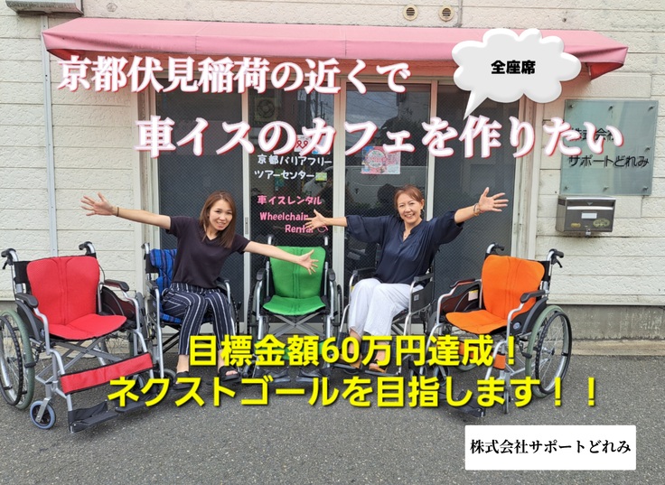 株式会社サポートどれみが車椅子カフェを開業します。集まった資金は、カフェの店内に座席として使う車椅子20台の購入費用とさせていただきます。