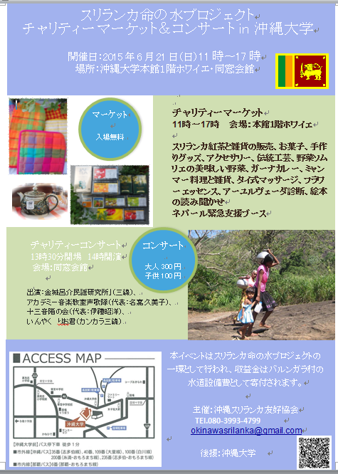 6月21日(日)11時~17時まで那覇市国場の沖縄大学内にてスリランカ命の水プロジェクトチャリティマーケットとコンサートを行います。