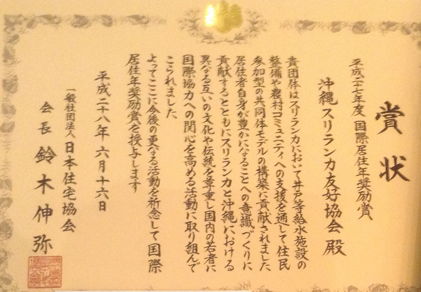 この受賞をスリランカバルンガラ村へも報告し、今後の励みとして参ります。